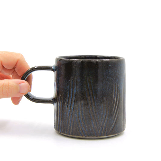 Elegant formede krus og kopper ligger behageligt i hånden. De er drejet med omhu i stentøj og har en fin kant, der gør dem rare at drikke af. Kopperne har en stor, afrundet og flad hank, som er særlig god at holde. Bunden er diamantslebet for at give en helstøbt oplevelse.