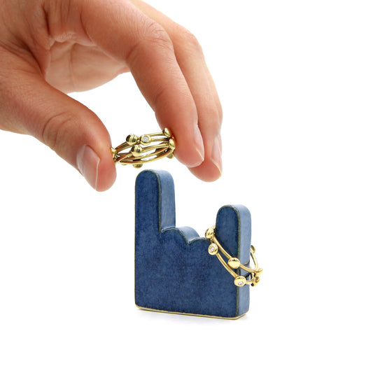 En leg med hænder, farver og attitude. DIGITS er små keramiske ringholdere formet som grafiske håndtegn – fra den klassiske pegefinger til rock-on og pinky.
