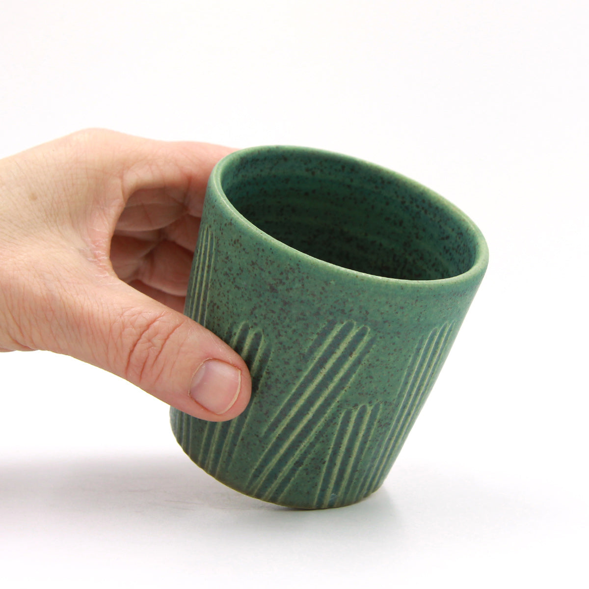 Hånddrejede krus med detaljerede udskårne mønstre, som gør dem ikke kun smukke at se på, men også behagelige at holde om. Flotte og funktionelle krus i americano-størrelse, der passer perfekt til en sort kaffe, kaffe med mælk eller en cappuccino.