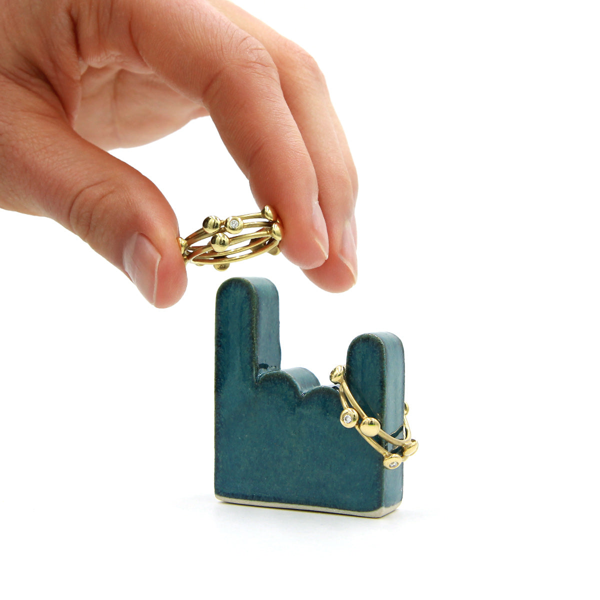 Et lille håndtegn med humor og kant. ROCK ON løfter pege- og lillefingeren og giver plads til flere ringe på én gang. Den er både praktisk og dekorativ – og gør det nemt at have smykkerne liggende fremme på en personlig måde.