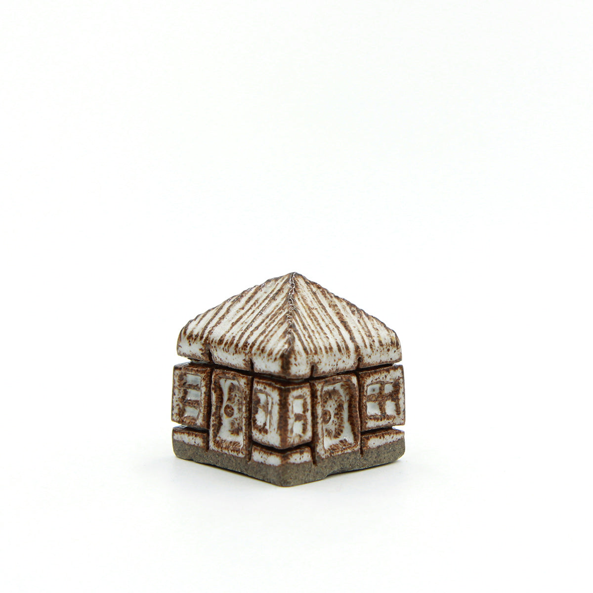 Et keramisk bindingsværkshus med stråtag, håndlavet i mørkt stentøj og glaseret i COCO. Den semi-blanke glasur fremhæver de fine strukturer og håndskårne detaljer. Cottage-huset står bedst alene med sit rolige udtryk og afrundede form, men kan også stilles sammen med de øvrige dele som en fritliggende bygning i landsbyen.