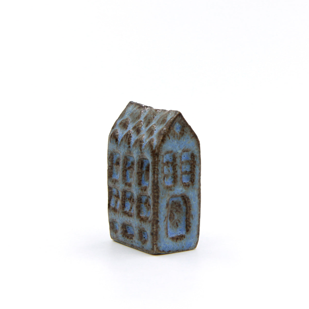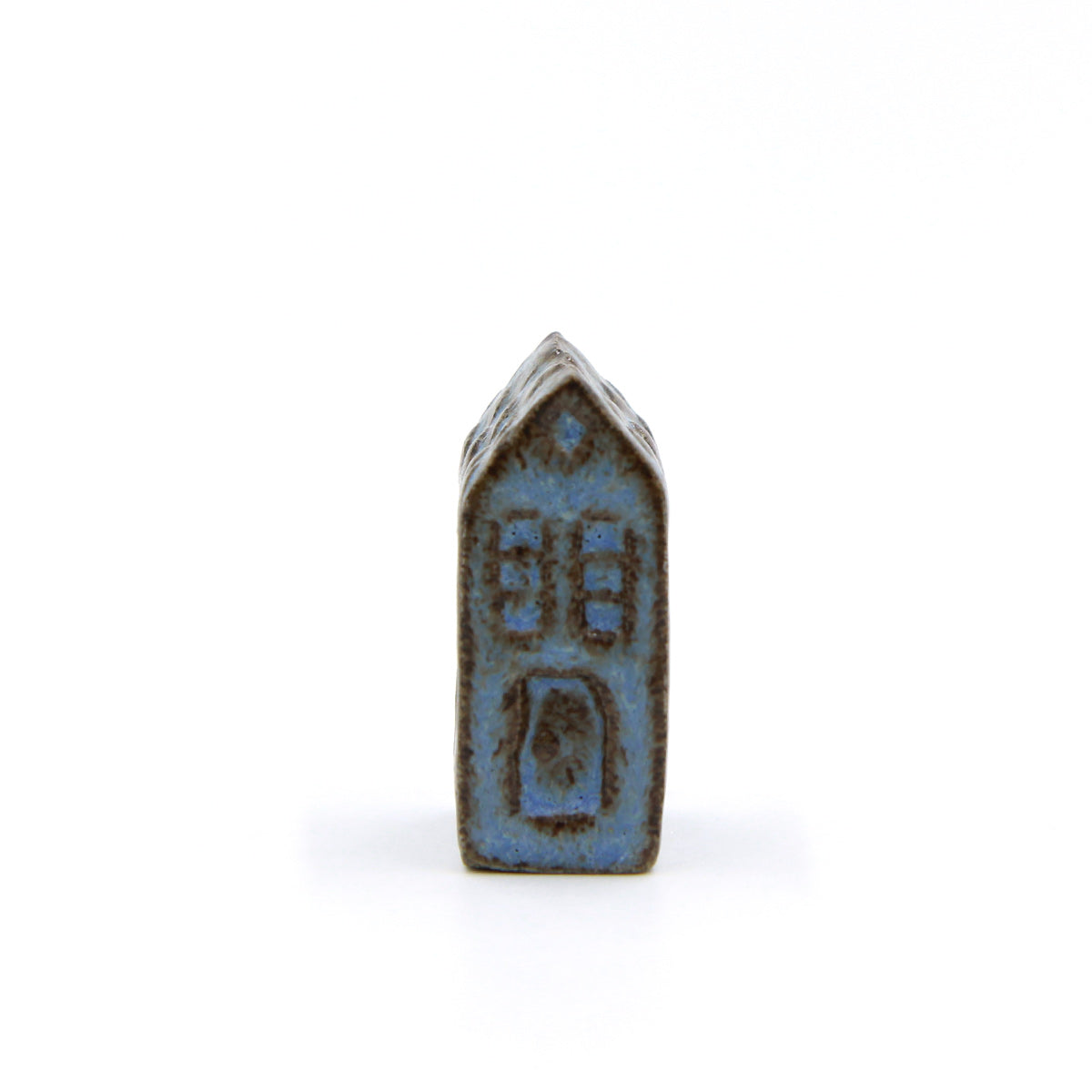 Et Olufshus i den høje smalle variant, håndlavet i mørkt stentøj og glaseret i AZUL. Den blanke glasur skaber et spil i overfladen, hvor den mørke ler træder frem gennem glasuren og giver dybde til de håndskårne detaljer i tag, vinduer og døre.