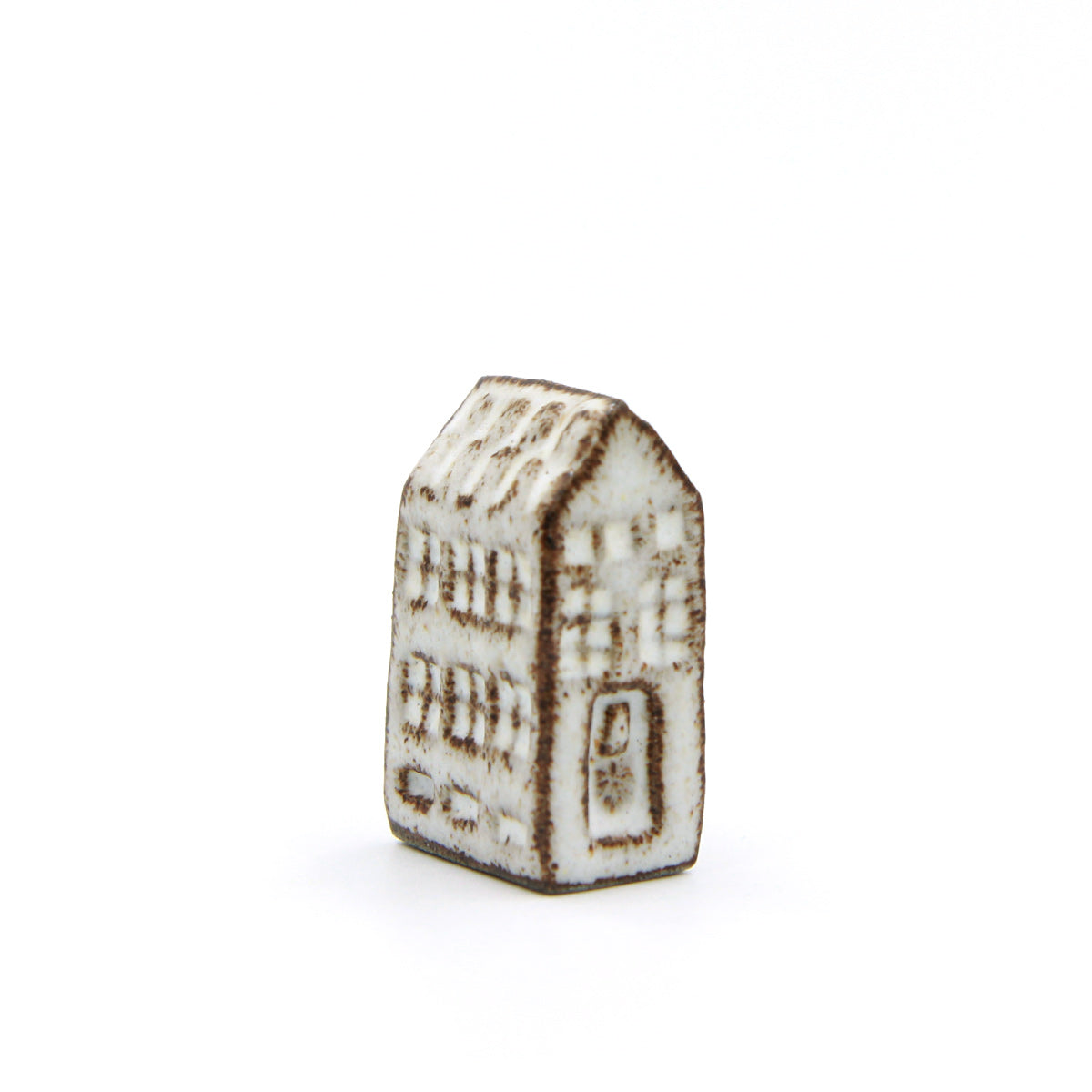 Et Olufshus i den høje ekstra smalle variant, håndlavet i mørkt stentøj og glaseret i COCO. Den blanke glasur skaber et spil i overfladen, hvor den mørke ler træder frem gennem glasuren og giver dybde til de håndskårne detaljer i tag, vinduer og døre.