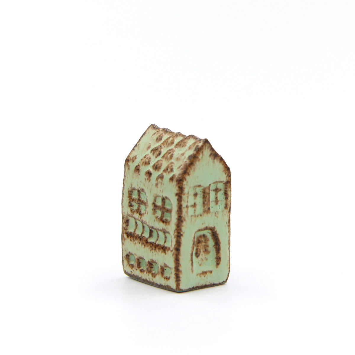 Et Olufshus i den høje ekstra smalle variant, håndlavet i mørkt stentøj og glaseret i MINT. Den blanke glasur skaber et spil i overfladen, hvor den mørke ler træder frem gennem glasuren og giver dybde til de håndskårne detaljer i tag, vinduer og døre.