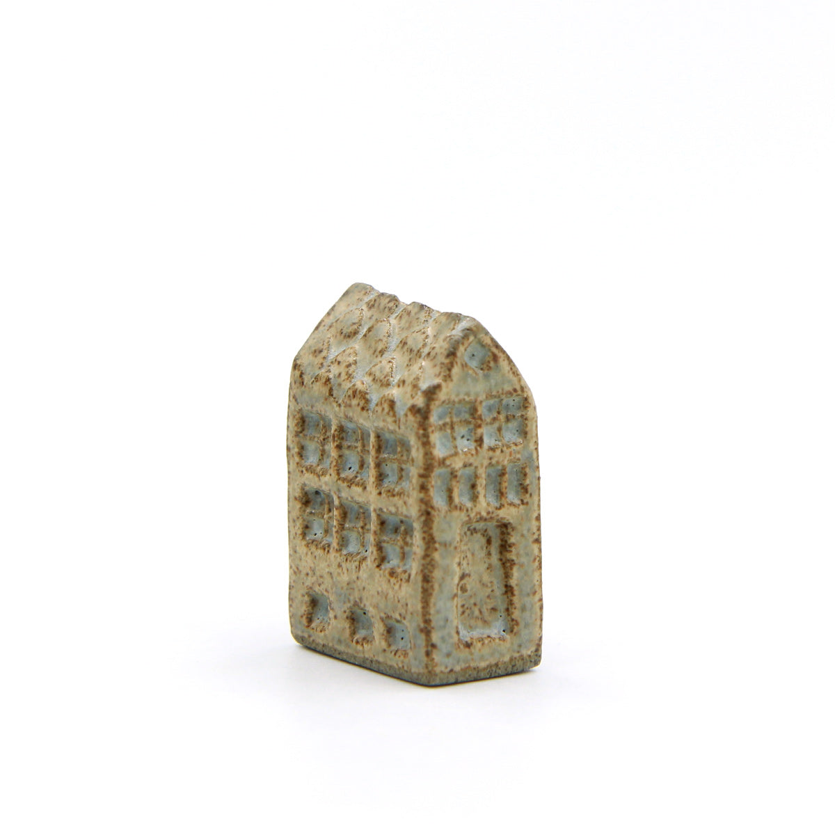 Et Olufshus i den høje ekstra smalle variant, håndlavet i mørkt stentøj og glaseret i MOCCA. Den blanke glasur skaber et spil i overfladen, hvor den mørke ler træder frem gennem glasuren og giver dybde til de håndskårne detaljer i tag, vinduer og døre.
