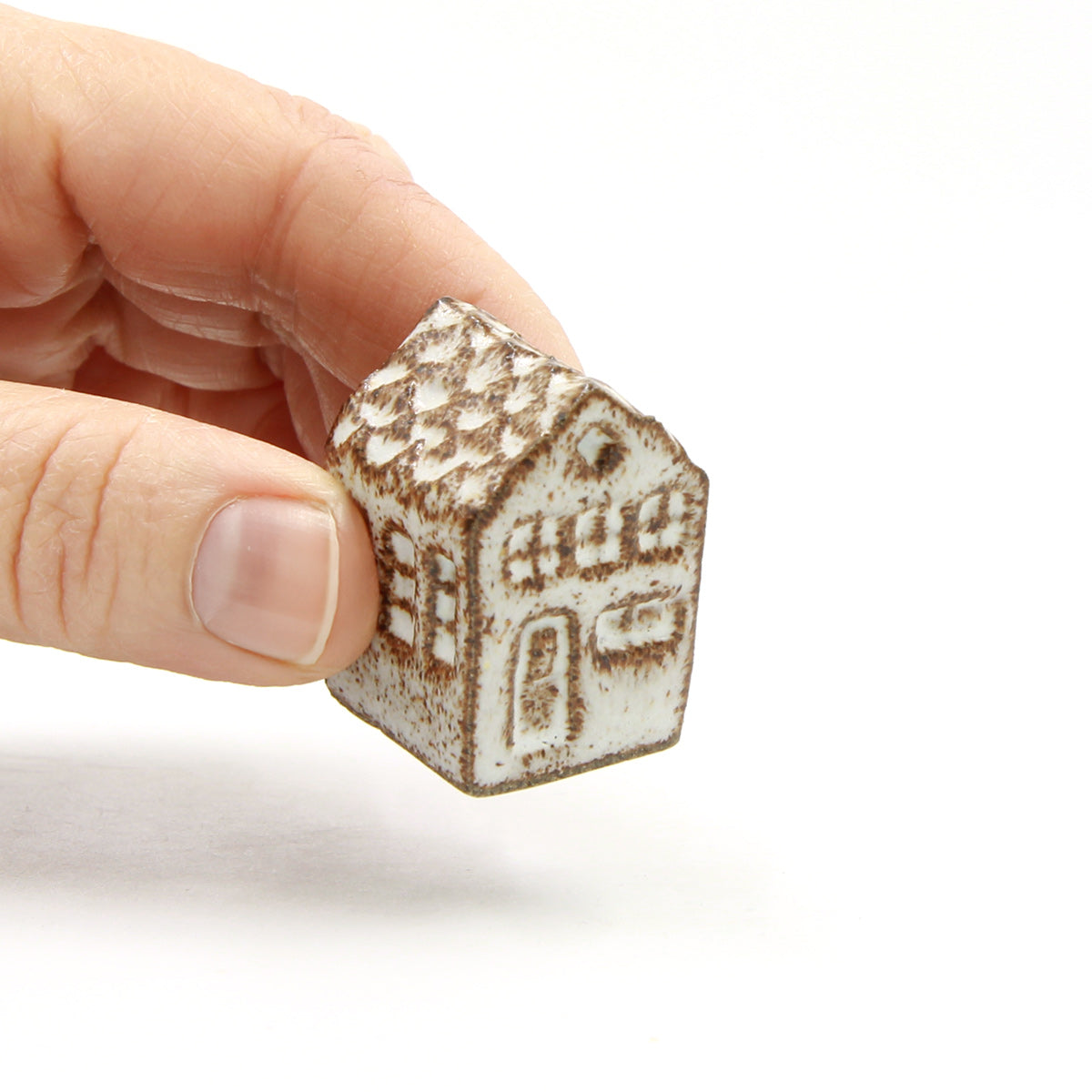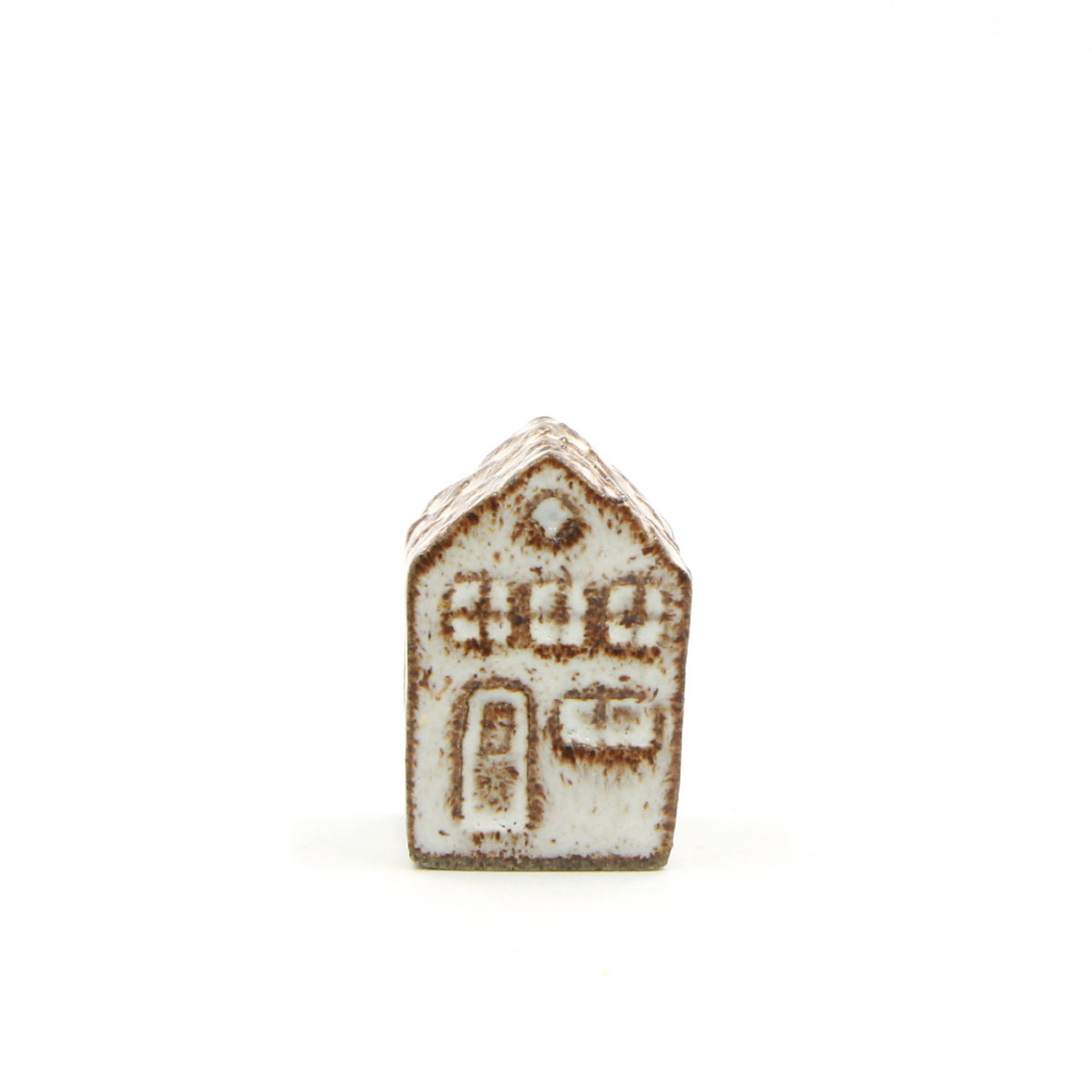 Et Olufshus i den lille smalle variant, håndlavet i mørkt stentøj og glaseret i COCO. Glasuren giver et levende spil i overfladen, hvor den mørke ler træder tydeligt frem og fremhæver tag, vinduer og døre med et grafisk udtryk.